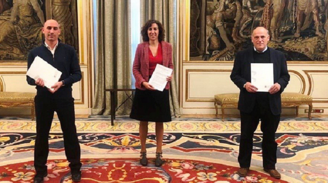 Y “con flores a María” fueron, el Presidente de la RFEF, Rubiales, y el Presidente de la Liga de fútbol Profesional, Tebas, para firmar lo que se vino a llamar el pacto del Palacio de Viana, sede, nada más y nada menos, del Ministerio de Asuntos Exteriores, Unión Europea y Cooperación.
