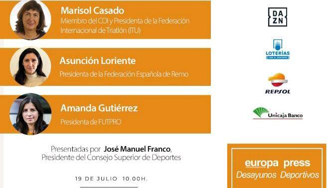 La presidenta de la Federación Internacional de Triatlón y miembro del COI, Marisol Casado, la presidenta de la Federación Española de Remo, Asunción Loriente, y la presidenta de FUTPRO, Amanda Gutiérrez, han sido este martes las protagonistas de los Desayunos Deportivos de Europa Press, evento que se pudo seguir en directo desde IUSPORT.