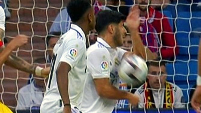 Con respecto al poémico penalti de Asensio por mano, Iturralde explica que Melero lo pita después de revisar la imagen en el VAR. "El brazo por encima del hombro siempre es mano, la tiene levantada desde el principio de la acción, aunque le pegue en el pecho antes de ir a la mano, es penalti. Ocupa un espacio que no debe. Los porteros de balonmano se hacen grandes para intentar ocupar espacio, y es lo mismo que sucede en este caso", concluye Iturralde..