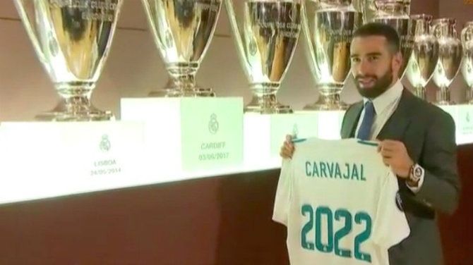 Dani Carvajal, lateral derecho internacional del Real Madrid, firmó su nuevo contrato hasta 2022 con el club madridista, en el estadio Santiago Bernabéu, donde mostró su felicidad y, tras reconocer que lo ha ganado todo con el club de su corazón, se marcó el reto de repetirlo.