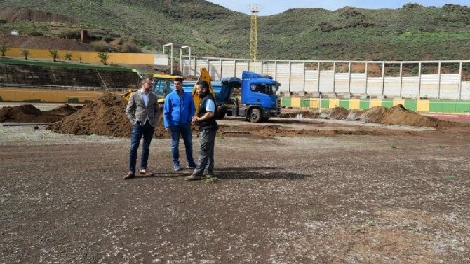 El alcalde de Gáldar, Teodoro Sosa Monzón, visitó este lunes las obras de instalación del césped artificial del campo de fútbol de la Ciudad Deportiva “Venancio Monzón” de San Isidro, cuyos trabajos comenzaron a mediados del pasado mes de diciembre con el estudio topográfico previo y este lunes arrancó el desmonte de tierra que dará paso al asfaltado y posterior instalación del césped por parte de la empresa adjudicataria de esta obra.