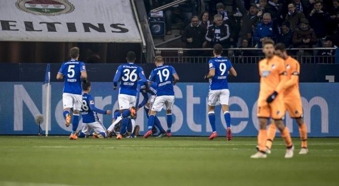 El conjunto de Gelsenkirchen se puso muy pronto por delante en el marcador. A los diez minutos, Thilo Kehler adelantó a los locales con un remate de cabeza por la escuadra. Sin embargo, dos minutos después, el delantero suizo-camerunés Breel Embolo recibió un pase y batió al portero de Hoffenheim para anotar el segundo.