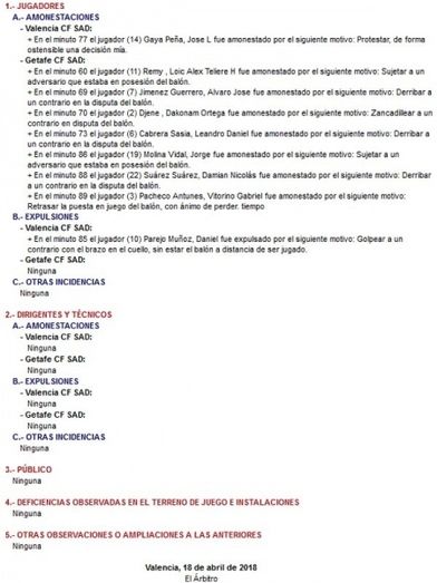 "En el minuto 85 el jugador (10) Parejo Muñoz, Daniel fue expulsado por el siguiente motivo: Golpear a un contrario con el brazo en el cuello, sin estar el balón a distancia de ser jugado".