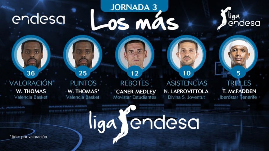 Will Thomas, Nik Caner-Medley, Nicolás Laprovittola y Thaddus McFadden se convierten en “Los más” de la Jornada 3 de la Liga Endesa 2018-19, al dominar en los diferentes apartados estadísticos.