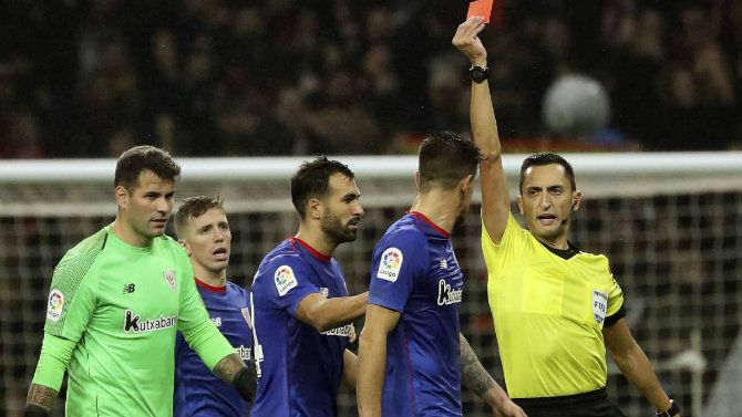 La sanción es consecuencia de la tarjeta amarilla y la posterior roja que le fueron mostradas una vez finalizado el encuentro liguero del sábado en el Wanda Metropolitano ante el Atlético de Madrid, tras una derrota bilbaína por gol de Diego Godín en el descuento.