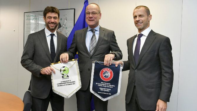 El presidente de la UEFA, Aleksander Čeferin, y el presidente de la Asociación de Clubes Europeos (ECA), Andrea Agnelli, se reúnen Comisario de la UE para el deporte Tibor Navracsics en Bruselas