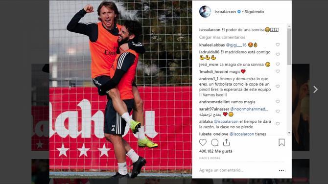 Isco Alarcón, centrocampista del Real Madrid, colgó una imagen sonriente, celebrando una acción del entrenamiento en la ciudad deportiva de Valdebebas con el croata Luka Modric, en un momento en el que está en el centro de la polémica tras ser descartado por el técnico Santiago Solari en Roma.