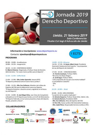 Deporte y Ocio organiza las VI Jornadas de Derecho Deportivo en Lleida con el título de “Hacia las nuevas leyes del deporte.”, que se celebrarán el 21 de febrero de 2019 en la Sala de Conferencias de l’Ilustre Col·legi d’Advocats de Lleida.