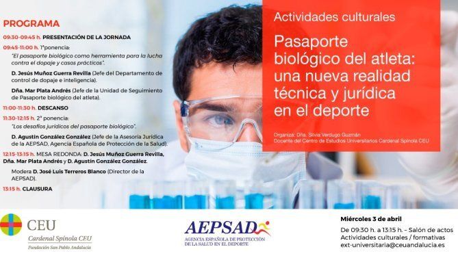 El salón de actos del Campus CEU Andalucía acogió el miércoles 3 de abril la Jornada ‘Pasaporte biológico del atleta: una nueva realidad técnica y jurídica en el deporte’.
