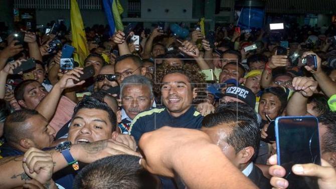 Decenas de aficionados del América se movieron entre empujones y alguno se subió en la camioneta en la que fue trasladado el jugador, quien será titular con el América tras la salida del argentino Agustín Marchesín al Oporto de Portu