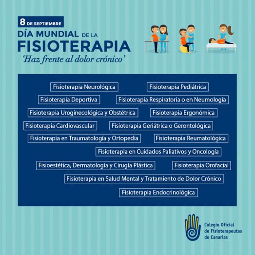 El Colegio Oficial de Fisioterapeutas de Canarias (COFC) ha preparado, con motivo de la celebración del Día Mundial de la Fisioterapia este 8 de septiembre, una campaña divulgativa en redes sociales y medios de comunicación para que la población conozca los distintos campos de actuación que tiene en la actualidad esta disciplina y las patologías que pueden tener mejora con el tratamiento fisioterápico adecuado.