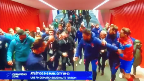 Después, la escena continúa en el camino hacia los vestuarios, donde la Policía separa un tumulto de personas de ambos equipos, aunque la mayoría de los jugadores del Atlético estaban sobre el terreno de juego, también Diego Simeone, agradeciendo a la afición su apoyo durante el encuentro.