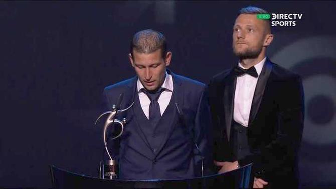 La pieza de bronce, de tamaño real y de 75 kilogramos, representa al DT argentino en una pose habitual de partido sentado en un cubo al borde del campo de juego, aunque se puede separar del cubo si se desea poner sobre un sofá.