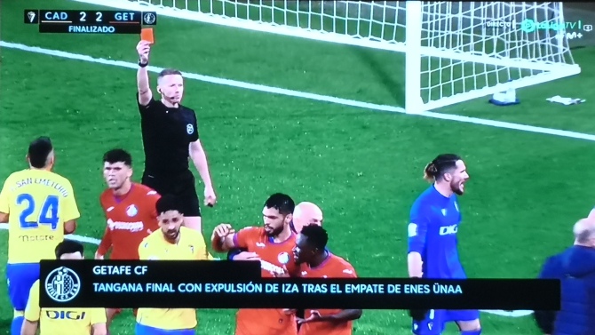 Con el encuentro finalizado, Hernández Hernández mostró una roja al futbolista del Cádiz 'Iza' Carcelén por una agresión al azulón Juan Iglesias.