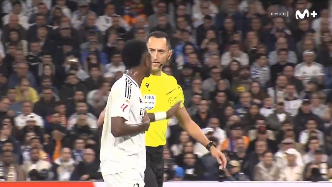 Las cámaras de Movistar Plus+ recogieron cómo el atacante del Real Madrid le lanzaba una recriminación al árbitro: "¡Tú siempre igual! ¡Tú siempre lo mismo".