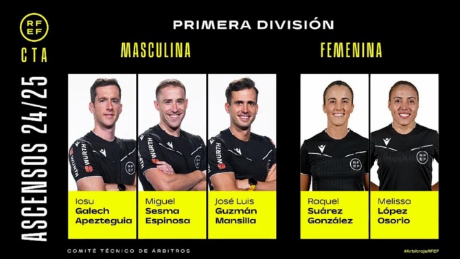 Los colegiados Iosu Galech Apezteguia, José Luis Guzmán Mansilla y Miguel Sesma Espinosa ascienden a Primera división para la temporada 2025-2026 y causan baja en la misma Pablo González Fuertes, Mario Melero López y Juan Luis Pulido Santana, que pasarán a ser árbitros VAR.