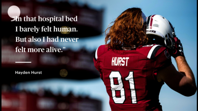 El primer impacto lo sufrió al ser derribado por un defensivo. La nuca del receptor rebotó contra el campo congelado, lo que provocó que de inmediato se llevara las manos a la cabeza. Recibió asistencia, pero fue autorizado a seguir jugando.