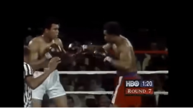 Pero su pelea más recordada fue la que protagonizó junto a Muhammad Alí en 1974 para defender el título de campeón del mundo en Kinshasa (República Democrática del Congo). Ambos paralizaron al mundo del deporte cuando el 30 de octubre de 1974 disputaron un combate épico, la llamada "pelea del siglo", y en la que puso contra las cuerdas a Alí.