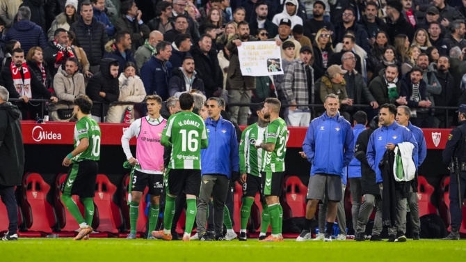 En el 88', el colegiado Munuera Montero detuvo el encuentro durante más de 15 minutos por el lanzamiento de objetos desde el fondo norte del Ramón Sánchez-Pizjuán, con una botella a punto de impactar en el portero verdiblanco Álvaro Valles. El choque se reanudó sin incidentes y el 0-2 no se movió del marcador.