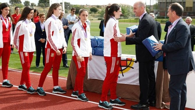 Las jugadoras de la selección femenina sub-17, que hace dos días se proclamaron campeonas de Europa, recibieron este miércoles la felicitación y el reconocimiento de la la Federación Española de Fútbol (RFEF), encabezada por su presidente, Luis Manuel Rubiales.