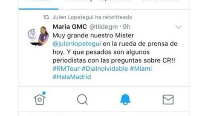“Muy grande nuestro Mister @julenlopetegui en la rueda de prensa de hoy. Que pesados son algunos periodistas con las preguntas sobre CR!! #RMTour #DiaInolvidable #Miami #HalaMadrid”, decía el comentario de la usuaria.