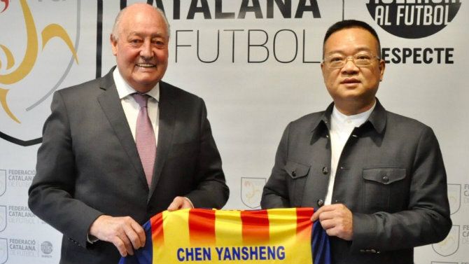 Una representación del club blanquiazul, encabezada por Chen Yansheng, visita la sede central de la Federació, donde les ha recibido Joan Soteras