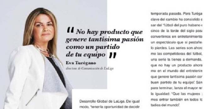 Eva Turégano desarrolló buena parte de su carrera profesional ante las cámaras y dejó la televisión para convertirse en la primera mujer en España en dirigir un gabinete de comunicación de una gran organización deportiva, LaLiga. Habla en primera persona desde la experiencia acumulada de muchos años como comunicadora del fútbol: "No hay producto que genere tantísima pasión como un partido de tu equipo".