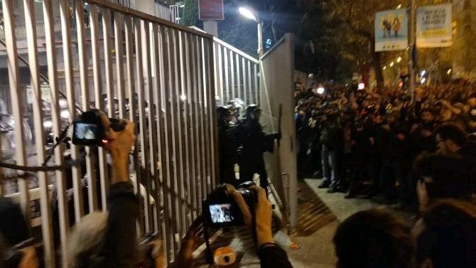 Tras varias cargas de los Mossos d'Esquadra contra un grupo de radicales que habían cruzado contenedores en la vía, un grupo se ha acercado a la puerta de acceso 18 del Camp Nou, donde han logrado doblegar una de las vallas metálicas que protege el acceso exterior del estadio barcelonista.